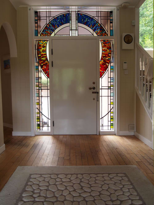 The custom and bespoke design service also covers coloured leaded designs known as overlay stained glass this process allows contemporary design to be applied with marbled and textured films to create individual designs for glass doors and walls.